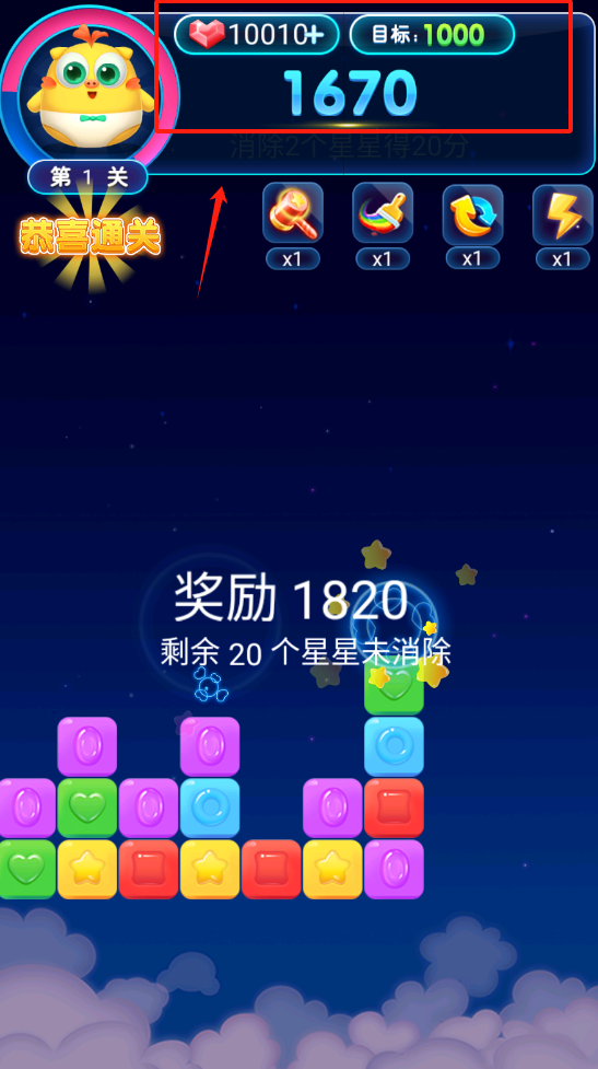 3、借助道具加快剩余星星的消除进度,完成目标后点击通关按钮领取奖励。