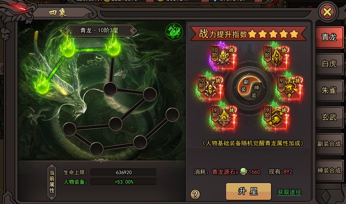 四象系统也会在角色等级达到90级时解锁,玩家可从青龙、朱雀、白虎、玄武这四个分支里挑选其一进行养成。该系统的每个阶段包含10颗星,玩家需消耗源石来激活每一颗星。源石的获取途径是材料副本,而副本次数能够通过购买周卡、月卡或者提升VIP等级来增加。此外,玩家还能使用钻石进行双倍领取奖励或直接扫荡副本,以此助力提升四象的星级与角色战力。