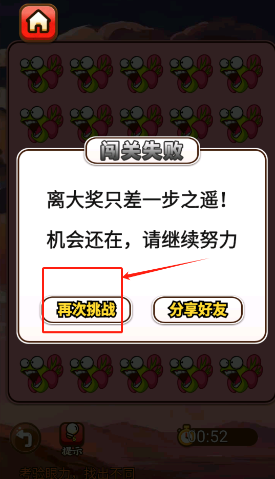 3、当看到“再次挑战”按钮时,点击该按钮即可重新启动游戏,继续进行闯关挑战。
