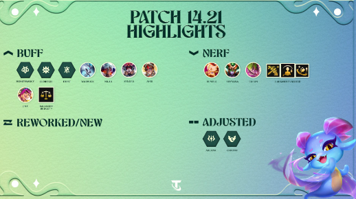 14.21 是我们的战术家皇冠补丁,我们专注于最具竞争力的游戏的平衡,并为尚未解决的问题提供增益。这也是《英雄黎明》复兴版的最后一个版本,祝您攀登贤者之路好运!