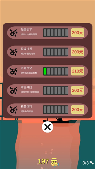 2、使用消耗收益来升级自己的钓具,这样就能让抛出去的鱼钩深入到更深的水域里了。