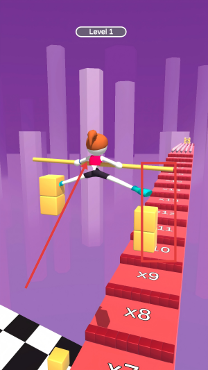3、借助平衡杆跨越红色阶梯间的间隔,利用收集到的方块延长杆的长度,以此突破阶梯障碍。