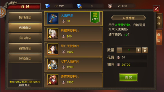 5、您在传说之塔获取的传说币,能够在传说商店里购买道具与大天使碎片,这些物品可用于大天使的养成。