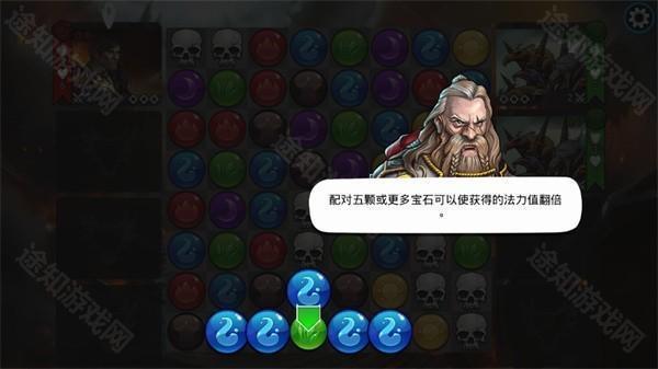 3、匹配相遇颜色的宝石会获得法力值,匹配四颗宝石或者以上可以再次进行匹配,匹配五颗或者更多的宝石可以获得法力值翻倍;