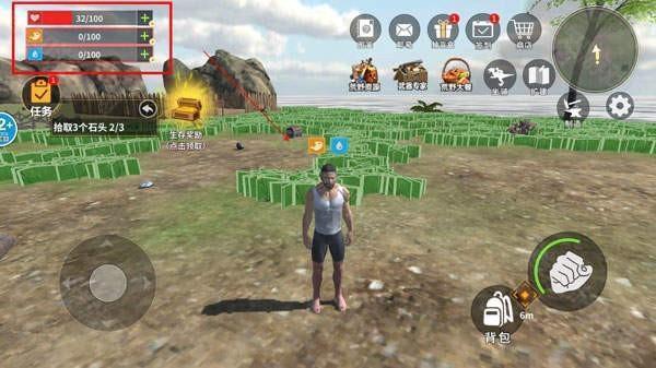 3、左上角的三条颜色条分别对应生命值、饥饿值与水分值,只有让这些数值维持在充足状态,角色才能正常存活下去。