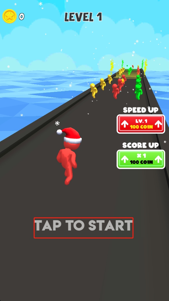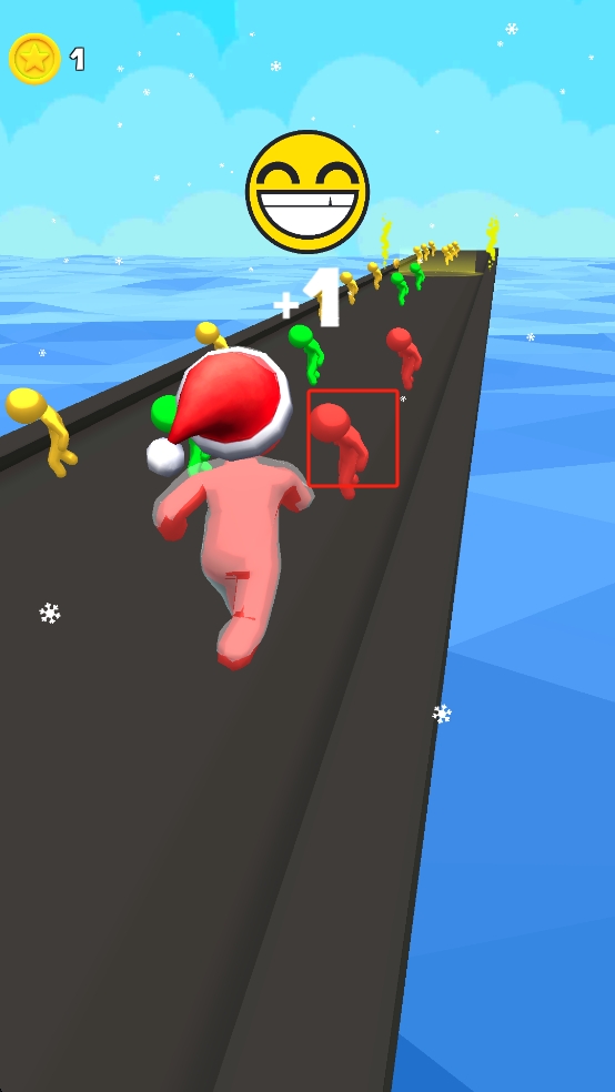 1、控制红色小人开始奔跑,在跑道上优先撞击相同颜色的小人,以此吸收他们来壮大自己的队伍,与此同时要避开不同颜色的小人,保持持续前进。
