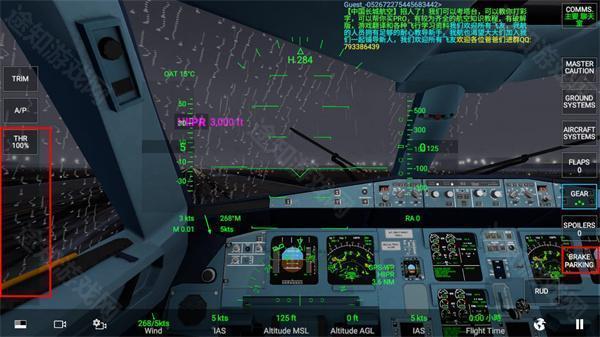 4,调整好襟翼后,我们就可以松开刹车BRAKE,然后滑动左侧的油门THR,将油门推到100%。