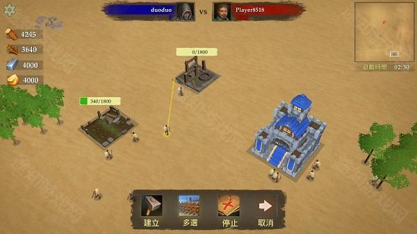 -- 选择完毕之后,便会开启对战。在这里你可以选择一个或多个工人来重新建造各种建筑,发展各项事业,比如农场、金矿等。游戏建造采用沙盒式玩法,因此在这片广袤的田地中,你可以选择任一地方建造,不断的发展壮大,训练士兵,想着胜利前进。