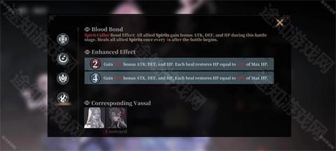 血脉关系:所有同阵营角色本局战斗阶段获得额外攻击力,防御力和血量。战斗开始后每隔15秒治疗一次所有角色。