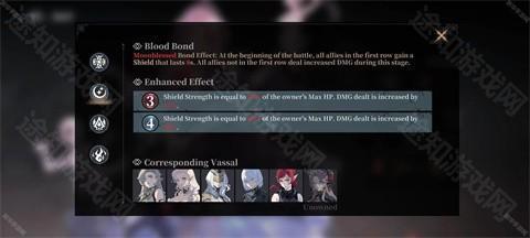 血脉关系:战斗开始时第一排所有角色获得1个持续8秒的护盾,所有不在第一排的角色本回合增强造成的伤害。