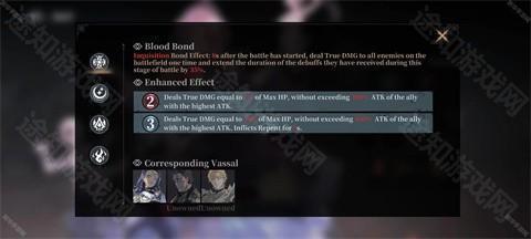 血脉关系:战斗开始后8秒,对战场上所有敌人造成1次真实伤害,并使敌方单位在战斗中受到的减益效果时间延长35%。