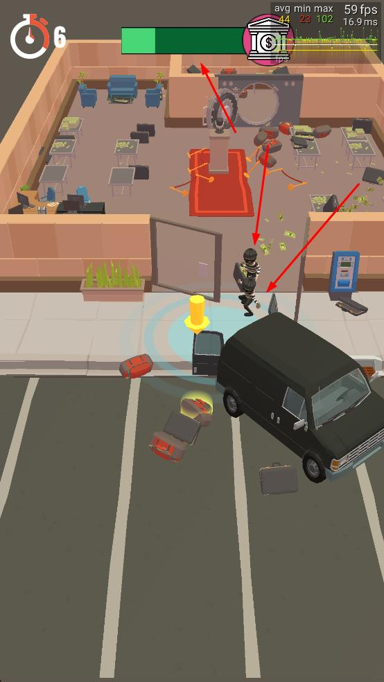 2、操控角色进入建筑,搬运散落各处的财物,注意时间限制,合理规划搬运路线,为达成抢劫目标打好基础。