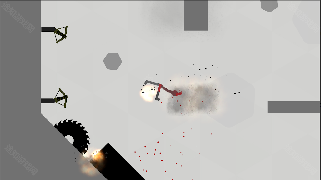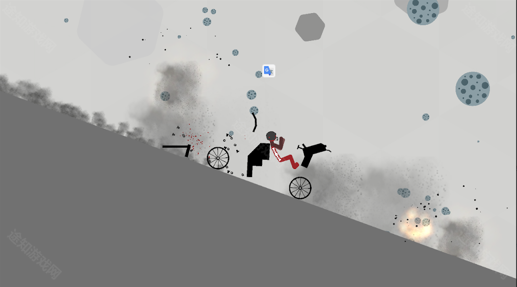 说到BUG,就是在那个有三个螺旋桨的地图里。当小人坐在购物车中,蓄力使购物车前进,若被第一个螺旋桨击中,小人的肢体就会卡在购物篮里,进而不停出现骨折的情况。不过这个BUG不太稳定,小人挣扎时,会翻跟斗致使购物车甩飞。经过几百次的实验,大概只有十几次能让小人持续挣扎,这种情况下最少能得十几万分,运气好的话能得到五十万以上的分数。