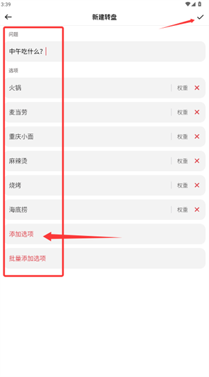 1、打开新建转盘的界面,填写讨论主题并配置选项内容,完成后确认保存相关设置。