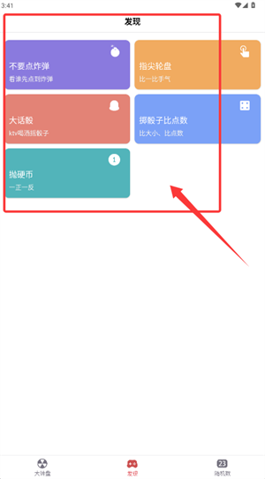 3、想探索更多有趣的玩法,可以去发现页体验炸弹躲避、掷骰子之类的游戏项目。