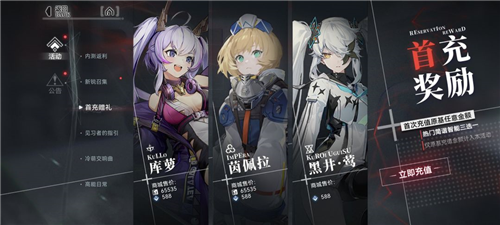 这个就不用多说了,这类型的游戏通常首充活动都是最划算的,充6块钱可以拿到一个英雄,这里建议选择黑井莺,因为黑井莺只能用点券购买,不能用游戏币购买,而且在这个测试版本里很强。反正测试期间搞个首充,公测的时候还能获得返利,早充早享受,怎么也不会亏。