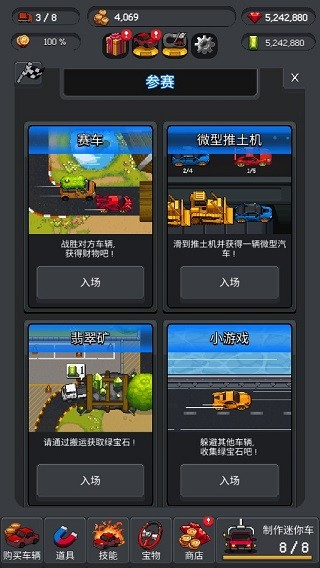 在游戏里,玩家无需为车辆额外花钱,所有资金都能投入到性能提升上。游戏画面采用像素风格,整体设计简洁明了,长时间游玩也不会让眼睛感到疲惫。