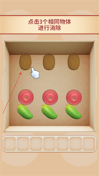 1在关卡场景中,点击那些堆叠在一起的各类物品,像甜品、玩具、水果之类的,它们就会被收纳到下方的收集区域里。