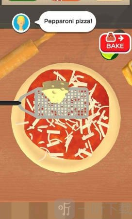 1. 披萨制作的第一关,会一步步引导你制作出美味的披萨。跟着游戏流程多次点击操作,就能完成这份比萨饼啦。