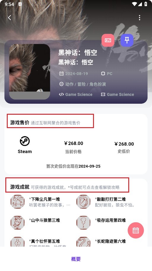 3、点击游戏封面进入详情页后,既能查看游戏在对应平台的售价,也能了解游戏攻略与成就相关信息。