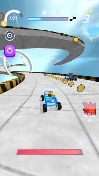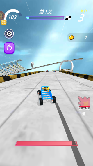 2、在赛道的关键位置设有加速带,当赛车开上加速带后,就能获得短暂的高速冲刺效果,速度提升的幅度十分显著。