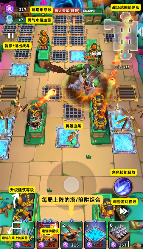 闯关过程中可结合随机出现的词条选择前进路线,自由搭配不同风格的塔防流派。游戏内提供近三十种建筑、英雄与地形元素,需要根据关卡特点与怪物类型进行灵活组合,制定针对性策略。