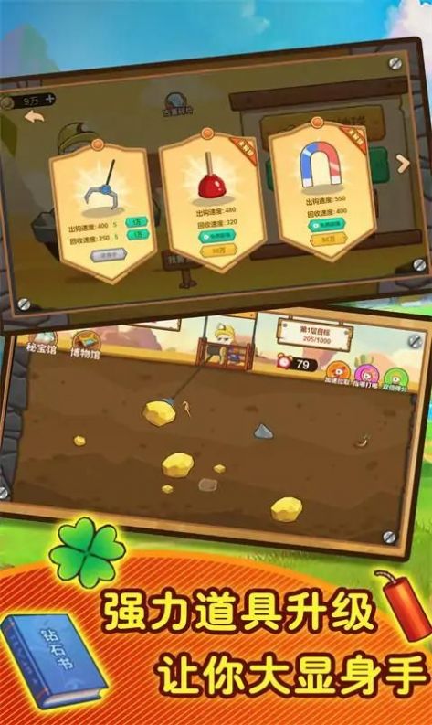 1、融合了黄金矿工玩法与射击游戏的模式,玩家需要通过射击和挖掘来开采宝藏;