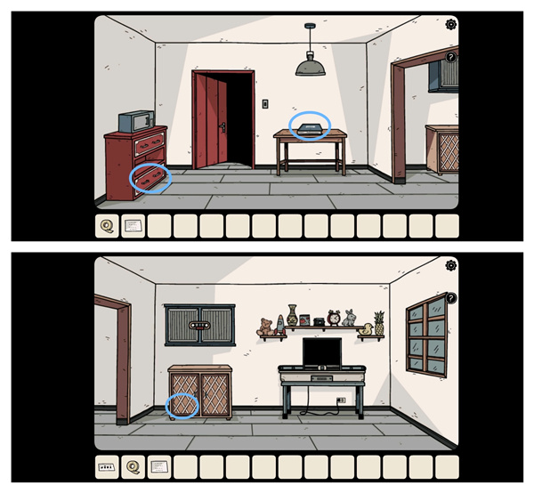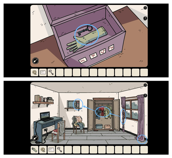 输入四个符号组成的密码,打开客厅左侧那个紫色的盒子,从中取出「手套」和「蓝色钥匙」;随后用蓝色钥匙开启二楼第一间房的门,接着留意衣服以及窗帘打结的数量,据此得到密码「1354」;最后打开保险箱,获取里面的「硬盘」。