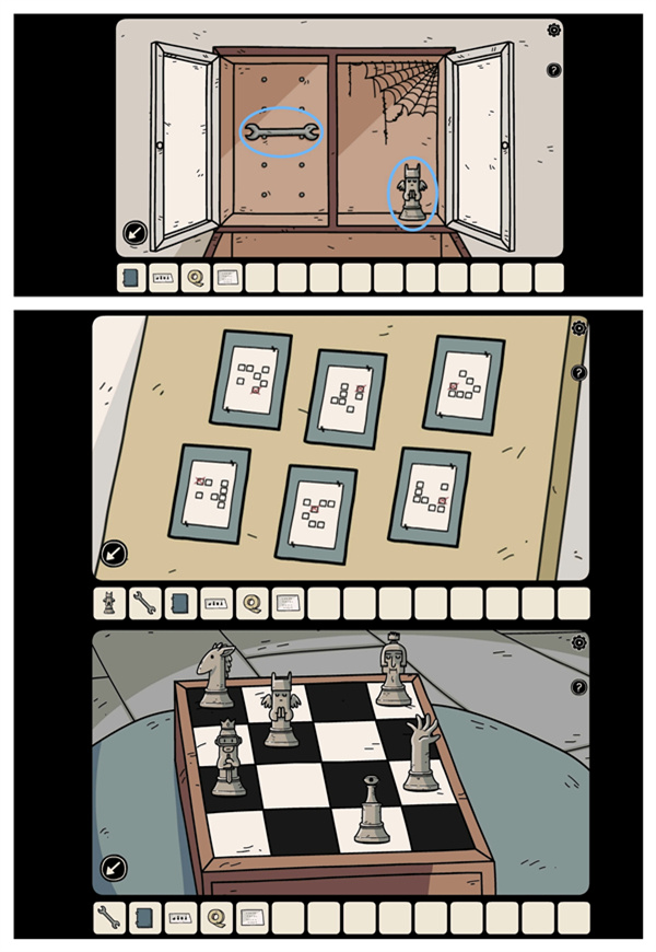 输入符号打开书柜,取出「扳手」与「棋子」;随后查看留言板上的卡片,留意每个棋子对应的位置;之后把棋盘上的棋子摆放到正确位置(如上图所示),即可获得「电池」。