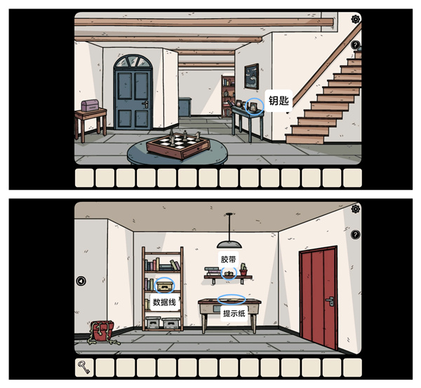 从相框背后取出那把「生锈的钥匙」,接着前往二楼右侧,取走「数据线」「胶带」和「提示纸」。