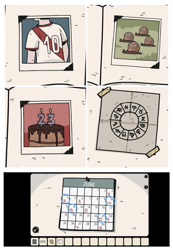 打开笔记本查看四张照片(留意数字与数量信息),接着前往二楼第一个房间的门口,结合日历获取四个「符号」。