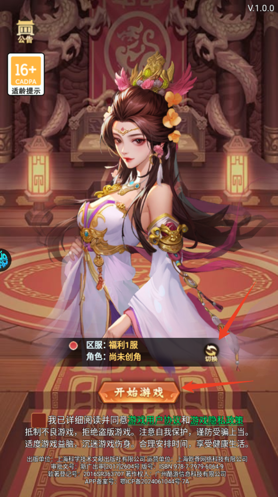 1、玩家登录账号可以看到如下界面,勾选同意协议,选择服务器,开始游戏。