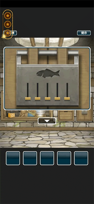 4、又是同样的房子,进入里屋,根据鱼缸里鱼背上点的样子,调节鱼缸下面的机关,得到一个小按钮,装在第一个屋子箱子的锁上。