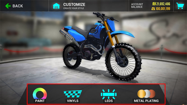 4、在对应功能界面中,可对所使用的摩托车进行改装操作,打造专属风格与性能。