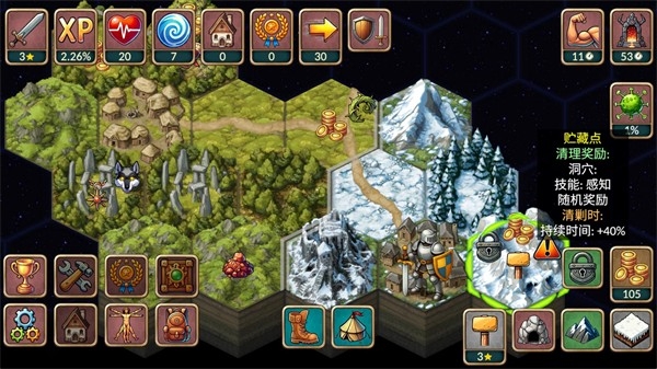 探索不同的地块获得资源,完成需要中的任务领取金币奖励。