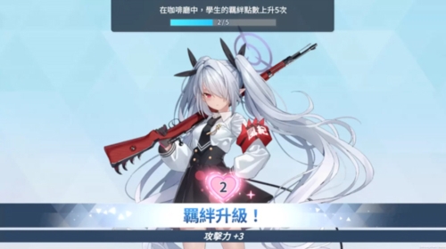 好感度的提升途径主要是课程表与咖啡厅,随着收录的学生种类越多,课程表前往的区域也会扩增,完成课程表可提升与学生的羁绊值、或者是在咖啡厅解锁后以送礼的方式提升羁绊值,咖啡馆与课程表的学生种类将会定时更换,但只有咖啡厅有额外一次可邀请特定学生前来的机会,对于喜爱的学生就努力培养羁绊等级,好处多多。