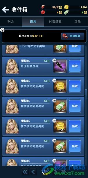 3、完成以后将会得到一些奖励,并可以在收件箱内领取;