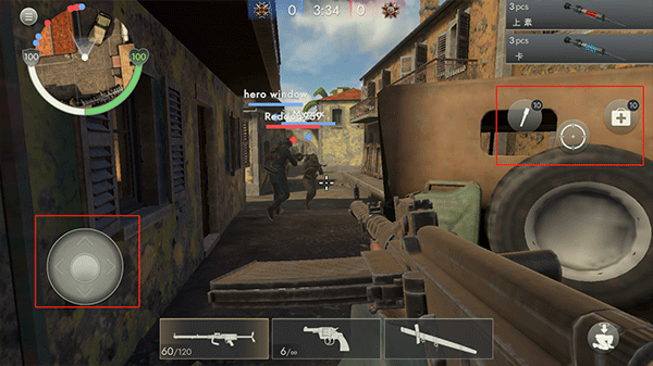 3、《二战前线1942》游戏开始后,通过左下角的摇杆操控角色移动,右侧则用于控制方向、射击、治疗等操作。